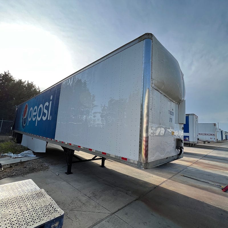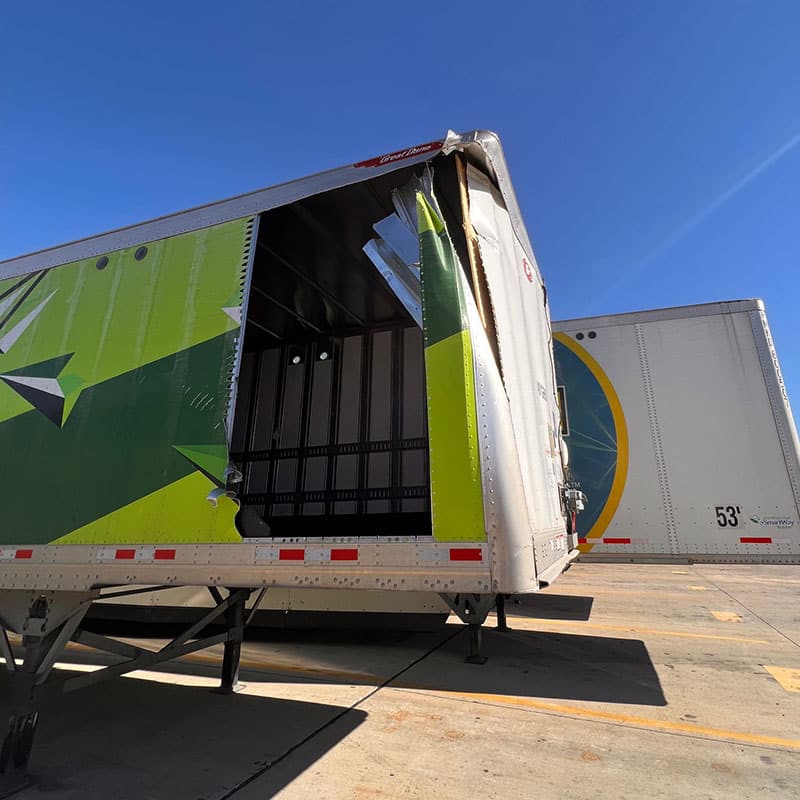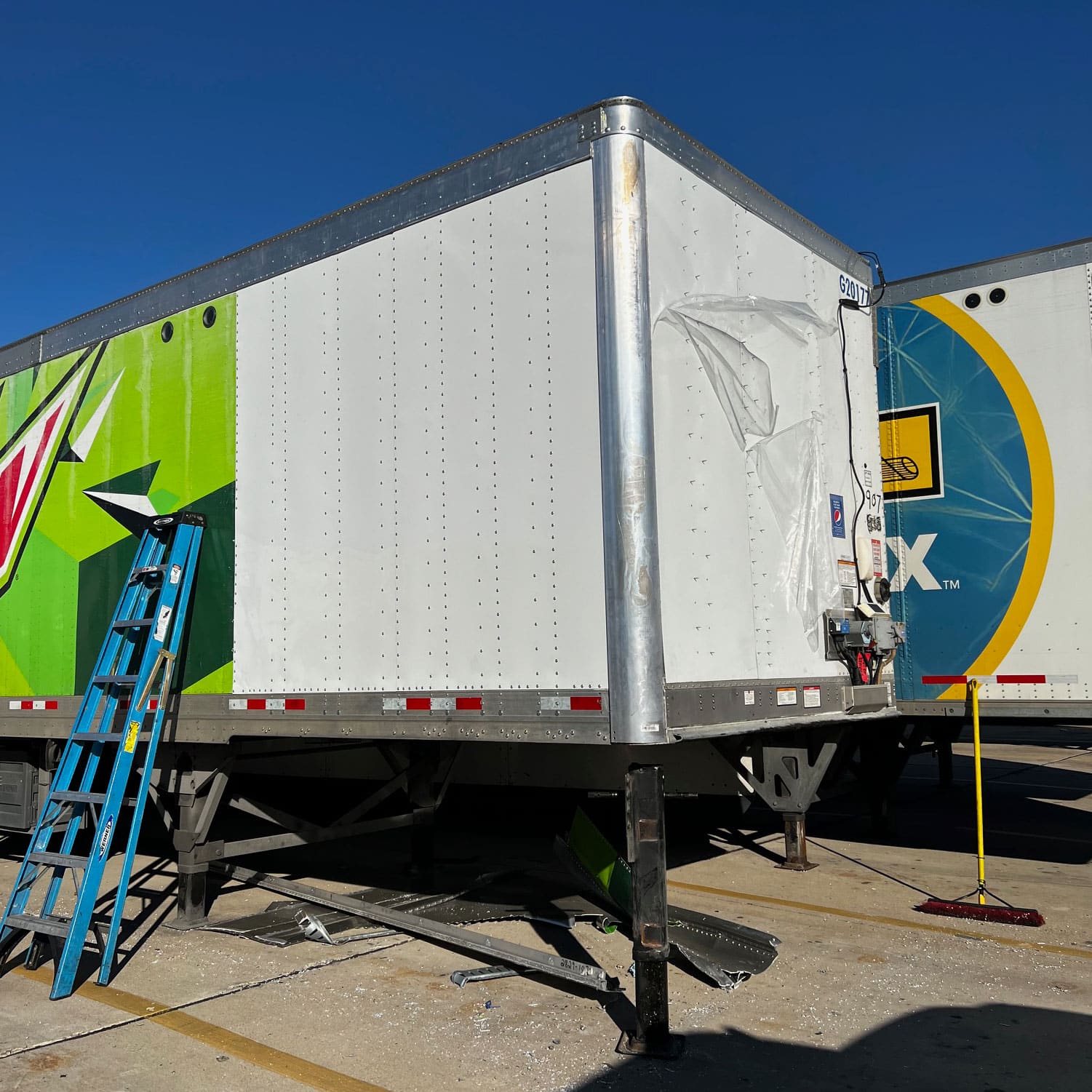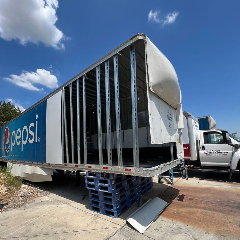 Trailer front nose collision. R&R side panels, interior posts, wood floor section, corner radius posts, front nose panels, front cross members and landing gear